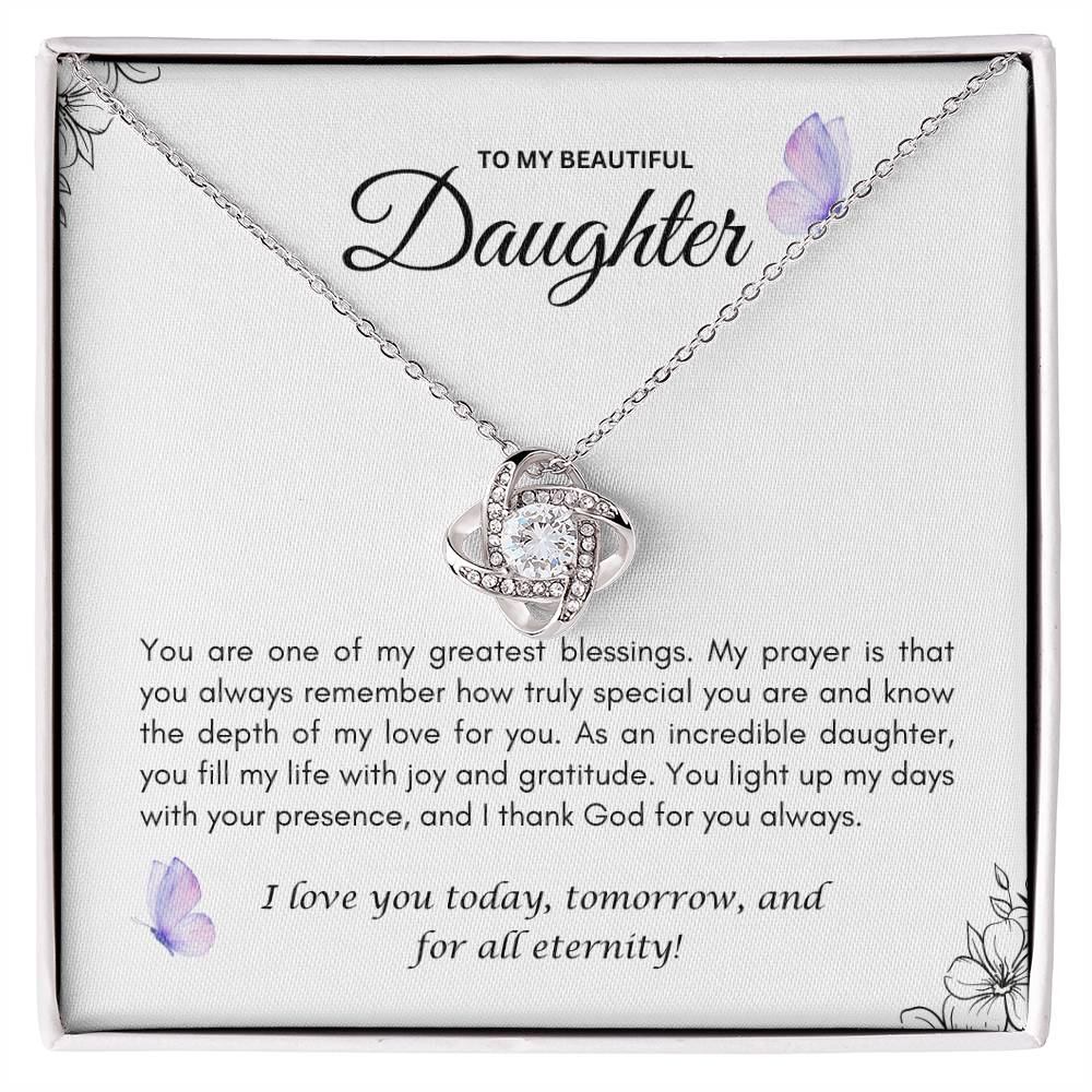 Every glance at the Love Knot Necklace reinforces the unbreakable bond you share. It’s not just jewelry; it’s a daily whisper of love and support, making her feel cherished and remembered, no matter where she is.